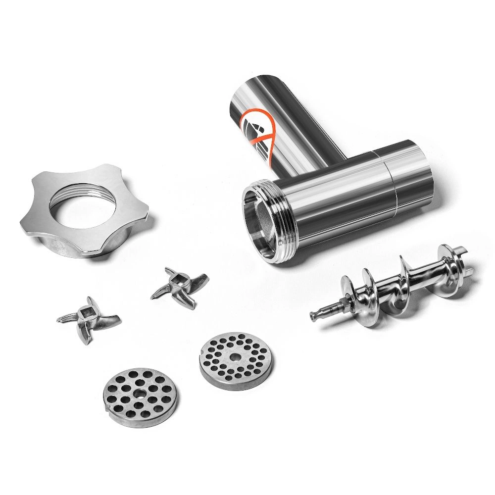 Zariadenie je vyrobené celé z vysoko kvalitnej nerezovej ocele, čo zaručuje nielen odolnosť voči mechanickému poškodeniu, ale aj jednoduché udržiavanie čistoty a splnenie hygienických požiadaviek. Súčasťou balenia sú dve sitká s priemerom otvorov 6 mm a 8 mm, čo umožňuje prispôsobiť hrúbku mletia potrebám používateľa – napríklad na prípravu plnky na fašírky alebo na výrobu klobás. Vonkajší priemer sitka je 59,5 mm a hrúbka 9 mm, čo zaručuje stabilitu a odolnosť počas prevádzky.
