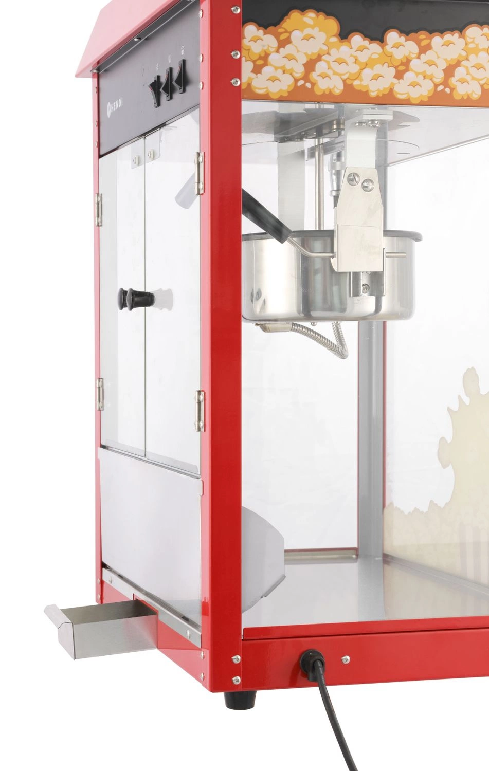 Stroj na výrobu popcornu s červeným vrchom Značka Hendi. Rám vyrobený z hliníkovej zliatiny. Kryt z tvrdeného skla a ocele s práškovou povrchovou úpravou v červenej farbe. Krídlové dvere z akrylového skla. Má praktickú klapku na odstránenie popcornu. Zásuvka pod komorou uľahčuje čistenie. Vnútro komory je vyhrievané a osvetlené. Trvanie jedného cyklu je približne 2 minúty.