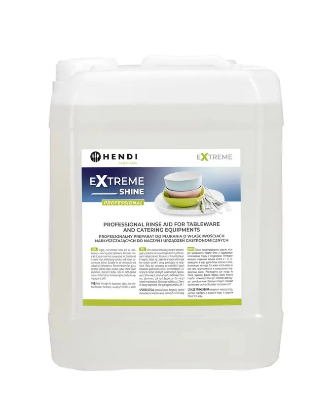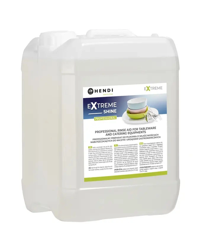 Prípravok na umývanie riadu značky Hendi je profesionálny umývací prostriedok na použitie v komerčných a priemyselných umývačkách riadu. Vďaka svojmu jedinečnému zloženiu výrobok nielen účinne napomáha oplachovaniu, ale aj leskne riad a odstraňuje šmuhy a rozmazané škvrny. Je ideálny pre rôzne typy umývačiek riadu a poskytuje dokonalý vzhľad bez potreby utierania.