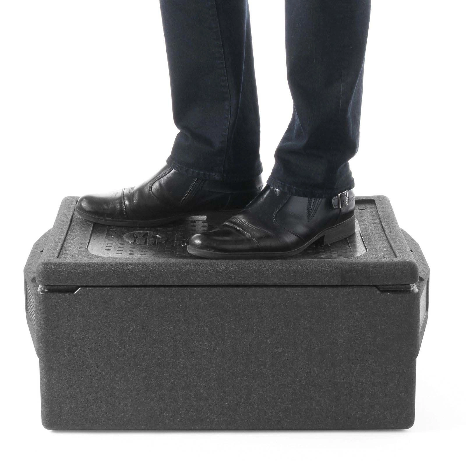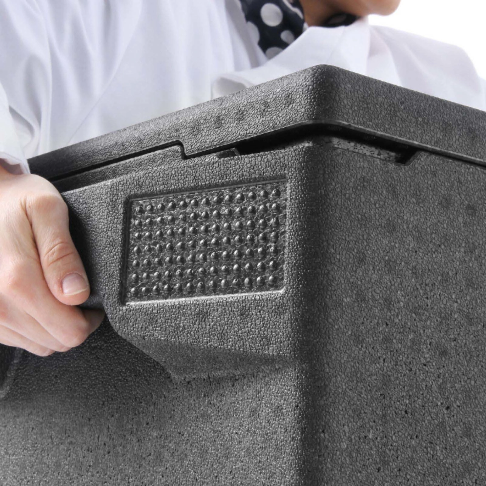 Izolovaný kontajner z penového polypropylénu na prepravu jedálóv nádobách GN 1/1 s maximálnou výškou 20 cm. Ergonomické rukoväte na prenášanie. Dno a veko profilované na bezpečné stohovanie. Kontajner spĺňa všetky požiadavky HACCP. Objem 39 l.