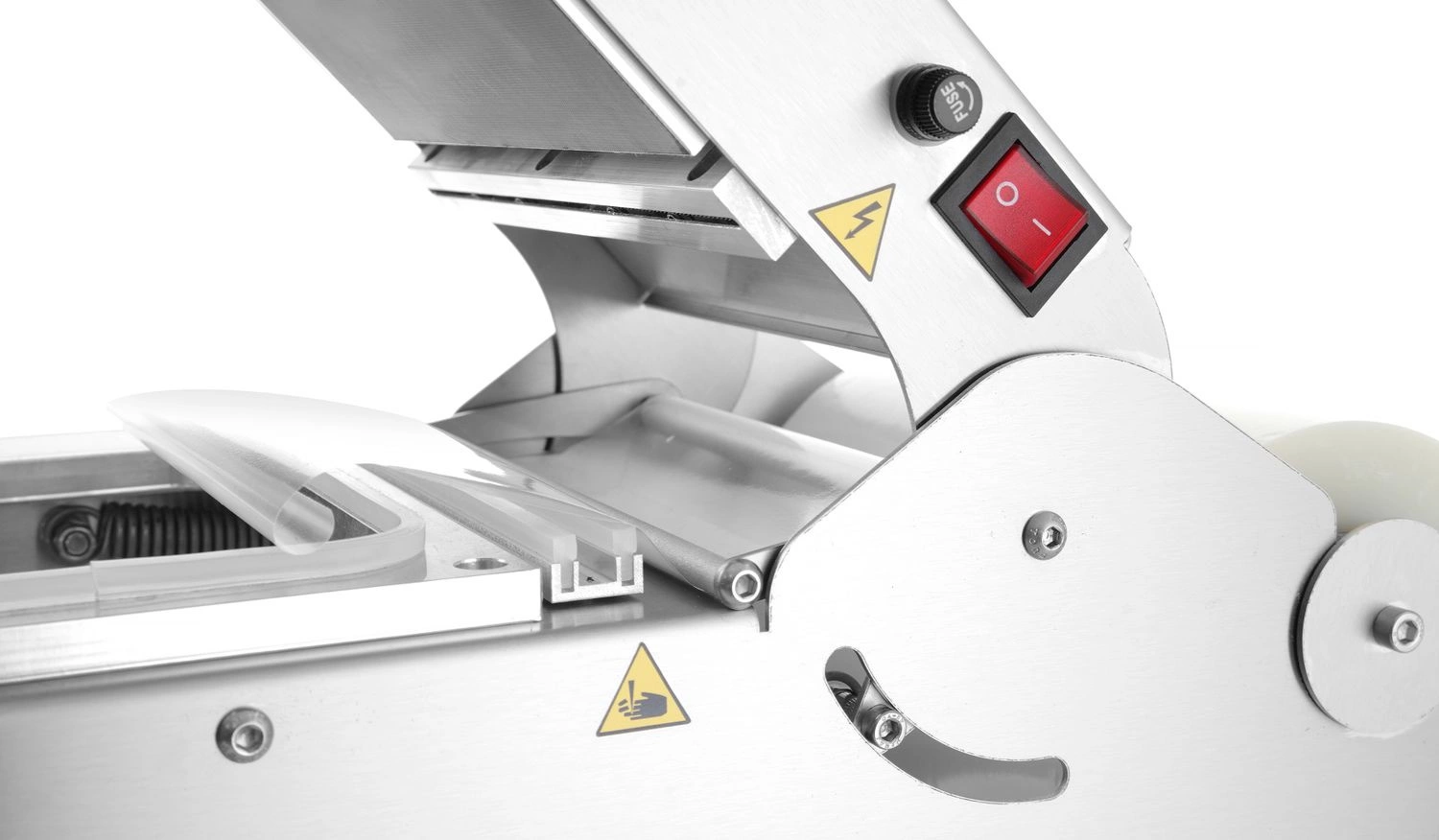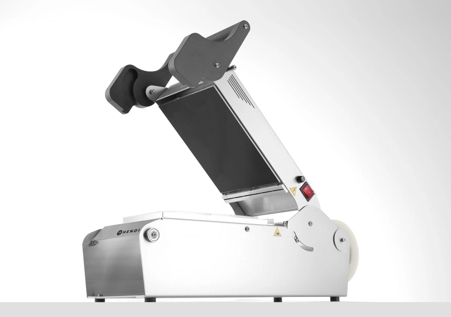 Stroj na zatavovanie zásobníkov Hendi. Plášť z 2 mm hrubej ocele odolnej voči kyselinám. Bezšvová konštrukcia umožňuje čistenie spodnej časti krytu bez odstavenia jednotky. Izolovaný základný rám. Tesniaci povrch s titánovým povlakom, ktorý zabraňuje prilepeniu fólie. Pohlcovač tlaku pomáha predchádzať prasknutiu obalov, preklenuje mikroštrbiny a zabraňuje úniku zapečatených potravín. Pripravené na použitie 8-10 minút vďaka vysokovýkonnému ohrievaču. Rovnomerná teplota na celej tesniacej ploche nastaviteľná od 50 stupňov; C – 210 stupňov; C. LED diódy indikujúce prevádzku zariadenia a podsvietený bezpečnostný spínač. Tesniaca jednotka je vybavená podávačom fólie s napínačom, ktorý zabraňuje pohybu fólie.
