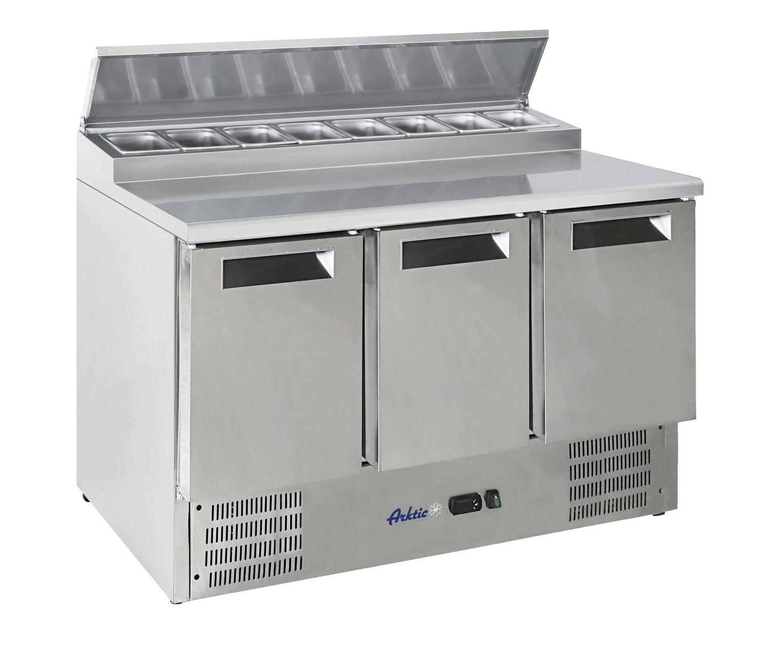 Trojdverová chladnička na šalát s nadstavcom Značka Arktic. Puzdro vyrobené z vysokokvalitnej nehrdzavejúcej ocele. Statické chladenie s ventilátorom. Automatické odparovanie kondenzátu. Digitálny displej. Elektronický termostat. Pó³³: 33,3x56 cm. Dvierka vybavené pohodlnou, tvarovanou rukoväťou. 4 plastové nožičky. Spodná jednotka.