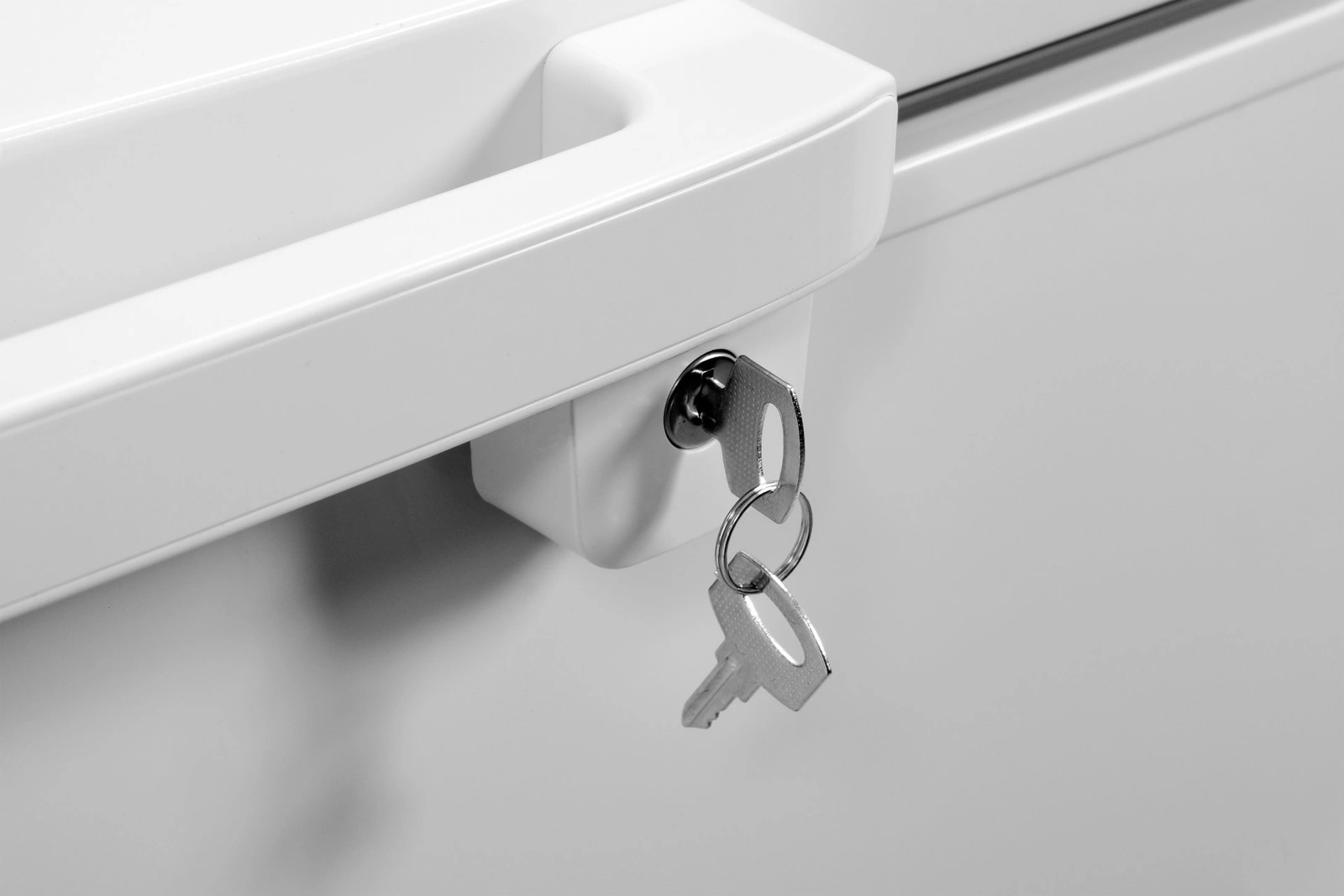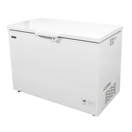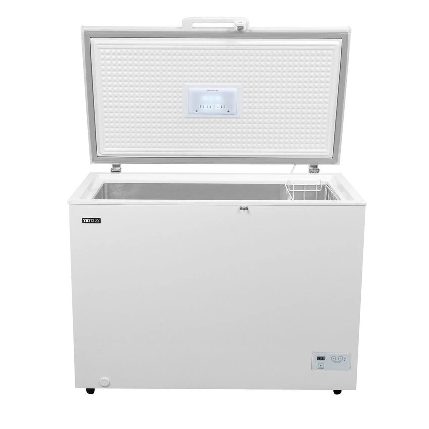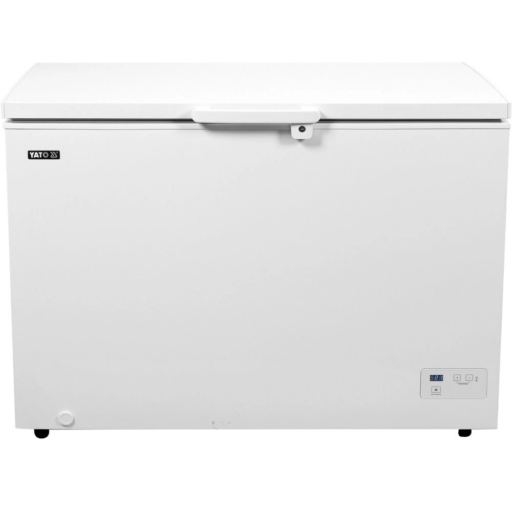 Truhlicová mraznička YATO s celkovým objemom 345 l. Je určený na skladovanie potravín pri teplotách od 10 stupňov C do -24 stupňov C. Samozatváracie výklopné dvere so zámkom zabezpečujú ľahký prístup k obsahu a zároveň udržiavajú konštantnú teplotu vo vnútri, čo je nevyhnutné pre zachovanie čerstvosti výrobkov. Zámok zaručuje bezpečnosť uložených výrobkovós. Zariadenie má elektronické ovládanie s digitálnym displejom, ktoré umožňuje presnú kontrolu a prispôsobenie podmienok skladovania konkrétnej potrebe.