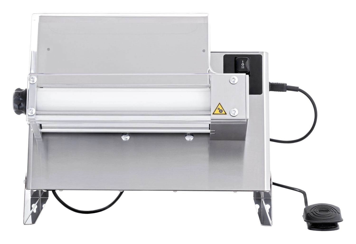 Elektrický stroj na tvarovanie pizze (valcovací stroj) Vyrobené z nehrdzavejúcej ocele. Elektrický nožný pedál. Ideálny spotrebič na vyvaľovanie studeného cesta na pizzu, knedle a cestoviny.