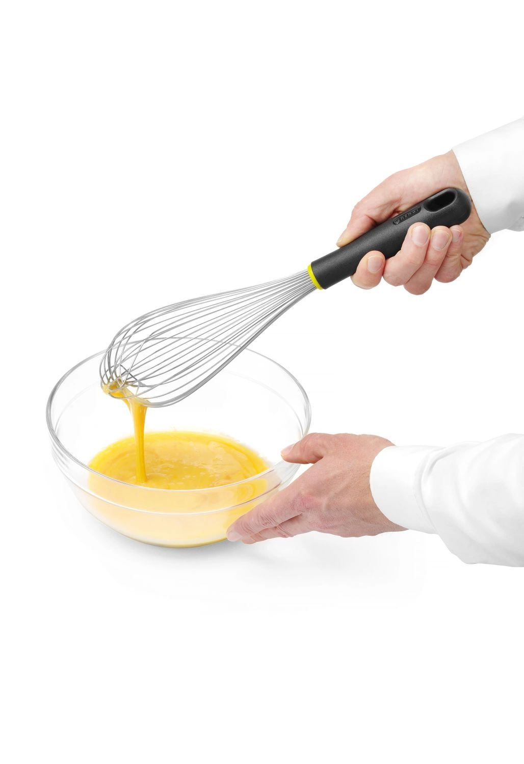 Rukoväť z nehrdzavejúcej ocele s polypropylénovou rukoväťou. . 35 cm dlhý. 12 tvrdých vretien s odpružením. Polypropylénová rukoväť s príveskom na zavesenie. Možno umývať v umývačke riadu.