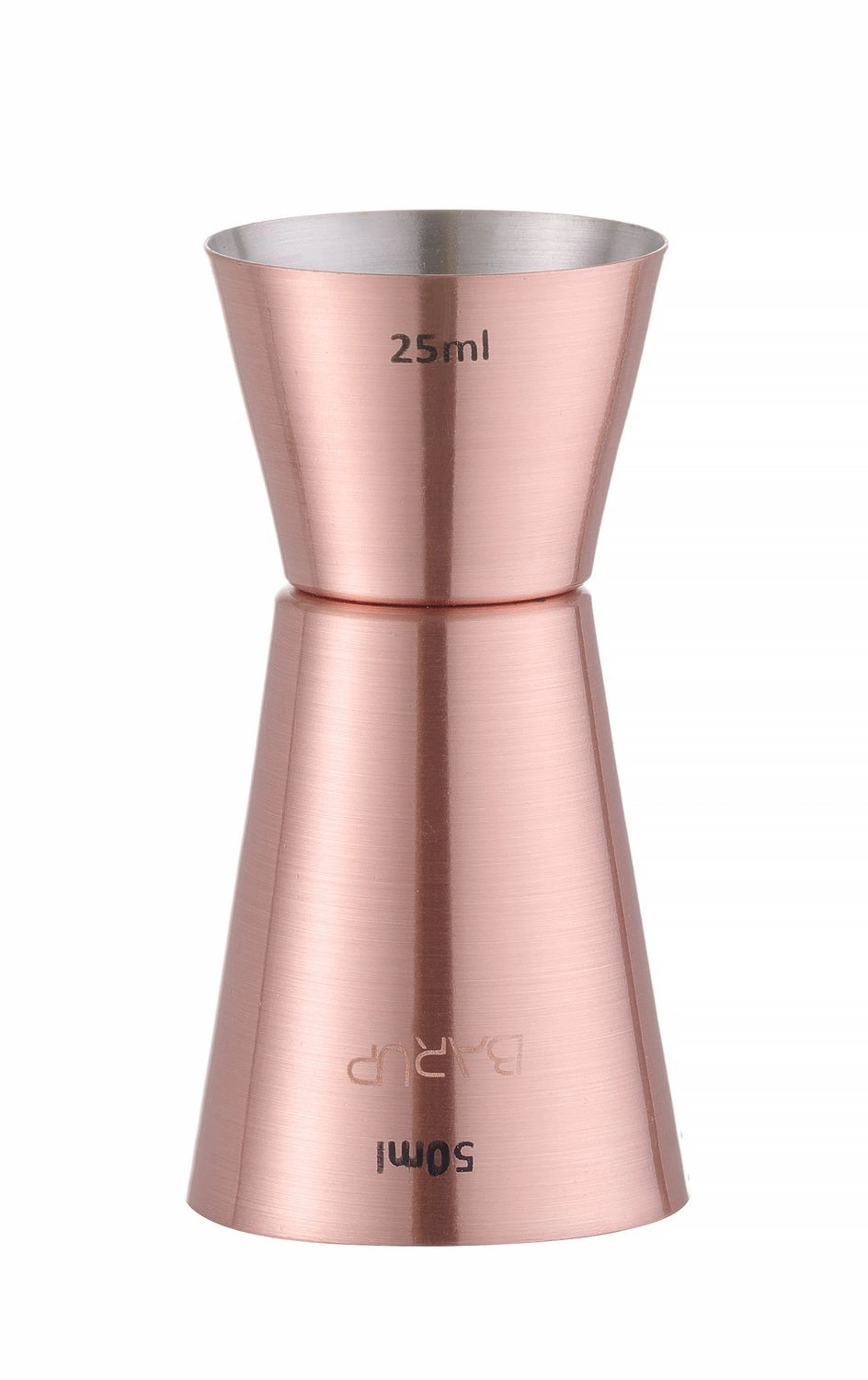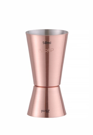 Zabraňuje pretečeniu a zabezpečuje dokonale vyváženú chuť nápojov. Vyrobená z nehrdzavejúcej ocele s medeným povrchom s lesklou úpravou. Obojstranná odmerka: 25/50 ml.