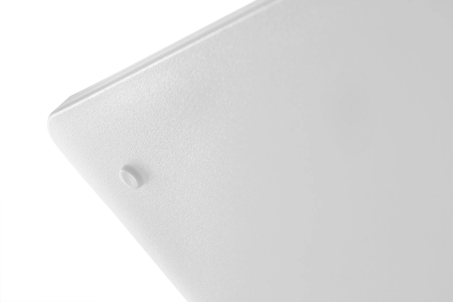 Doska na krájanie z polyetylénu, rozmery 35,5x25 cm. Biela farba. Výrez na povrchu zabraňuje vytekaniu šťavy pri krájaní výrobkov. Protišmykové nožičky.