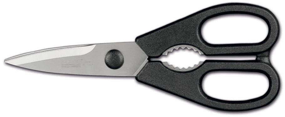 Univerzálne kuchynské nožnice Ambrogio Sanelli z nehrdzavejúcej ocele AISI 420, tvrdosť 54-55 HRC. Čepele majú na reznej hrane jemné vrúbkovanie. V rukoväti majú ďalšie zúbkované hrany na lúpanie orechovów. Rozoberateľné na dve časti, ľahko sa čistia.