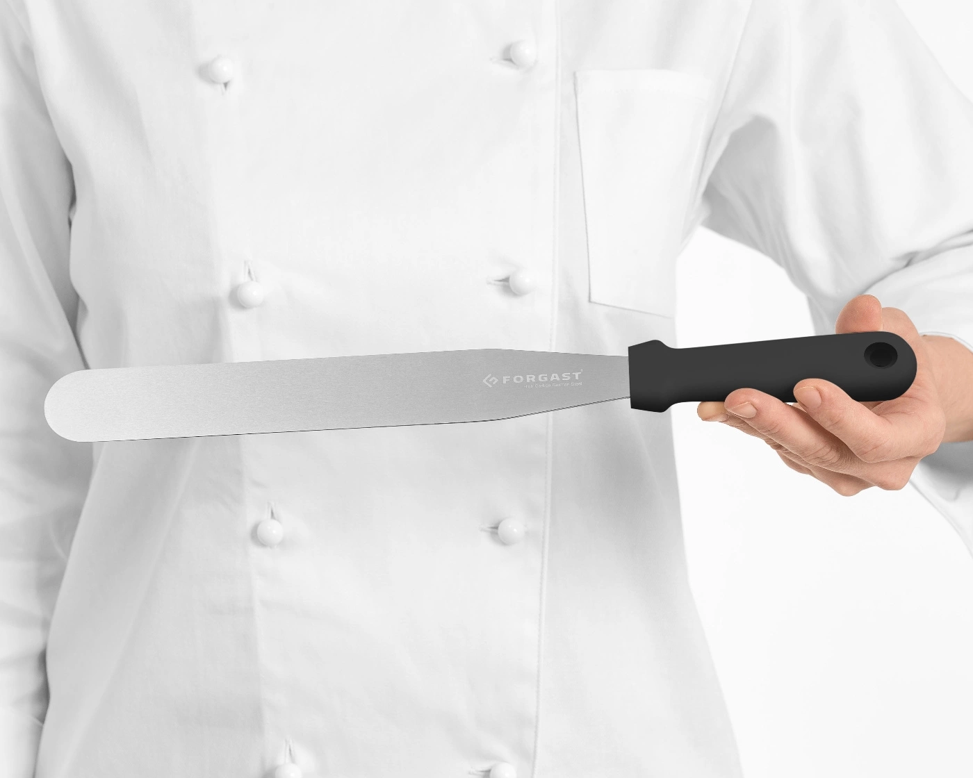 Úzka cukrárska špachtľa FORGAST FG11209 je profesionálny cukrársky nástroj, ktorý sa osvedčí ako v cukrárskych dielňach, tak aj v domácej kuchyni. Vyznačuje sa pevnou konštrukciou a ergonomickým tvarom, čo ju robí ideálnou na presné rozotieranie hmôt, krémov a dekorácií na povrchu pečiva. Malá šírka umožňuje detailné dokončenie aj tých najmenších detailov.