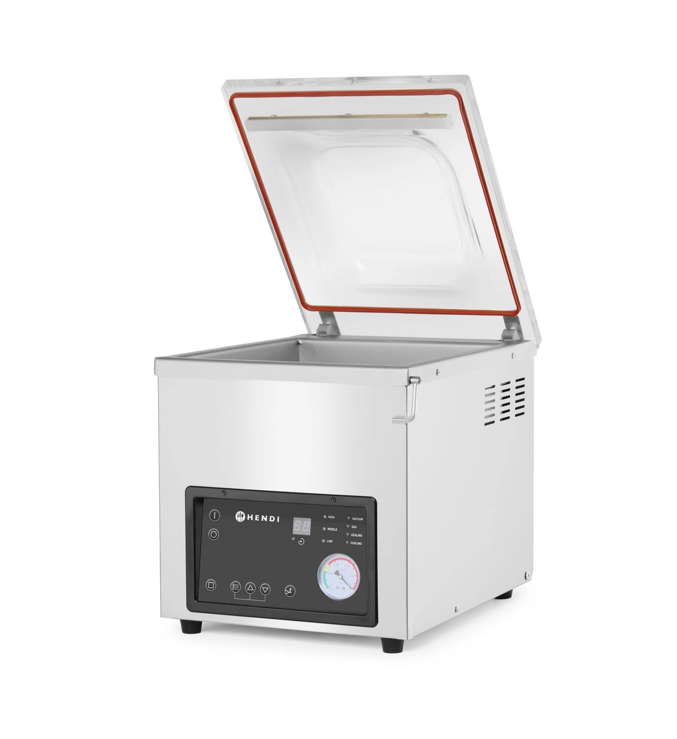 Určené na balenie potravín a technických výrobkov. Vysokokvalitná konštrukcia a komora z nehrdzavejúcej ocele 304. Vypuklé veko pre veľké porcie. Priehľadné veko na monitorovanie procesu balenia, vyrobené z materiálu s vysokou hustotou na predĺženie jeho životnosti. Tesnenie v tvare V „V” pre vysokú mieru úniku. Digitálny displej. Jednoduchá manipulácia, automatická prevádzka. Nastaviteľný čas tesnenia, indikátor tlaku. Výkon čerpadla 20 m 3 /h