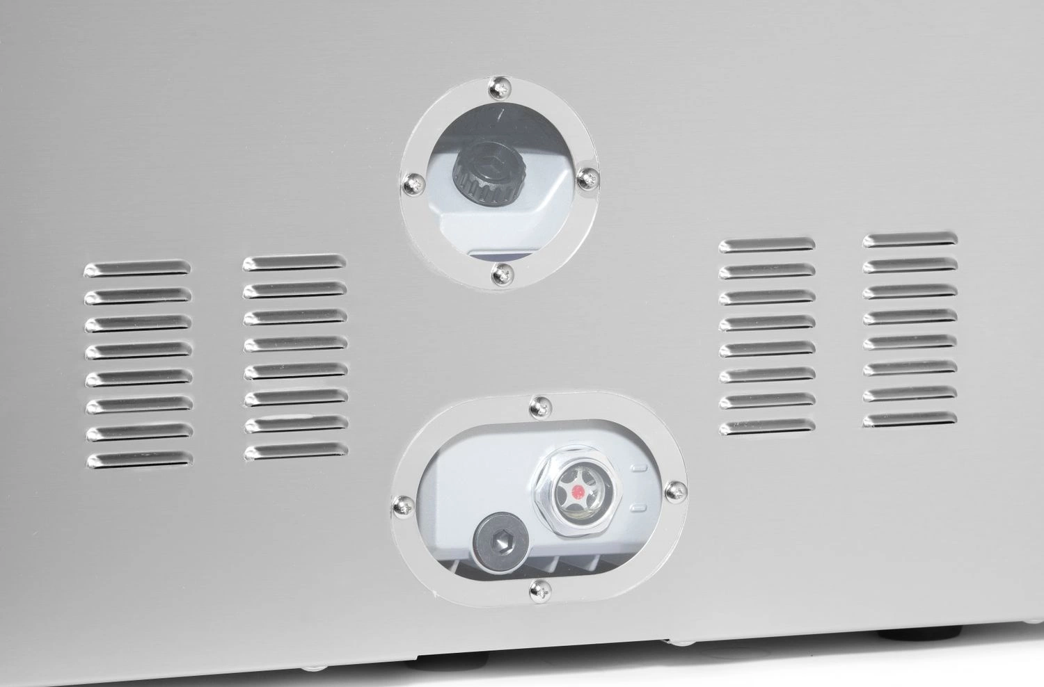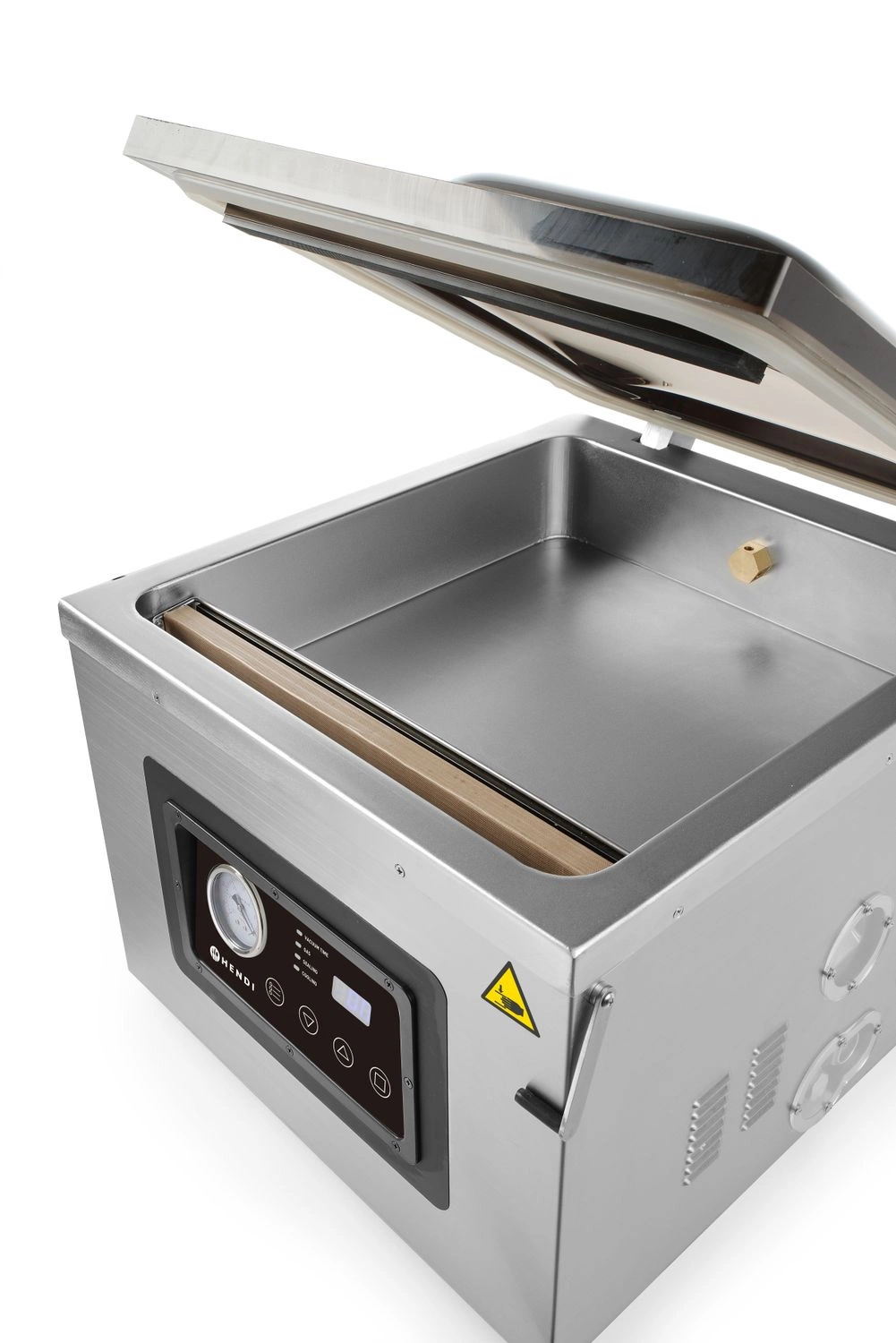 Komorový baliaci automat Profi Line 410. Nastaviteľný čas generovania próžnia a tesnenia, plnenia, chladenia. Možnosť prevádzky na automatické alebo manuálne ovládanie. Možnosť balenia tekutín a potravín s vysokým obsahom vody. Digitálny displej a analógový manometer. Puzdro a komora sú vyrobené z vysokokvalitnej nehrdzavejúcej ocele. Dno s veľkou priehlbinou a vypuklým priehľadným vekom umožňuje balenie veľkých porcií. Svorka vo vnútri komory na uchytenie vrecka.
