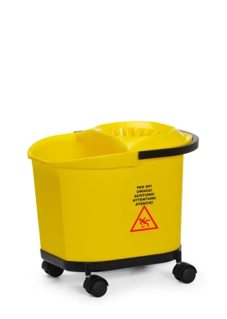 - Vozík so štyrmi otočnými kolieskami – zaručuje plnú mobilitu vedra a umožňuje jednoduché manévrovanie aj v úzkych priestoroch alebo na chodbách. Vďaka tomu je možné efektívne a bez námahy presúvať vedro medzi rôznymi zónami upratovania, čo výrazne skracuje čas práce.