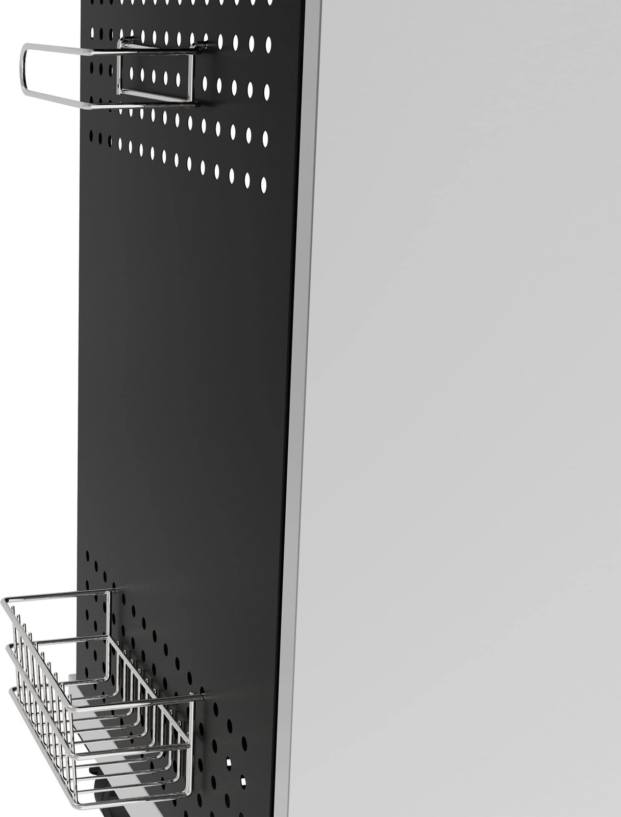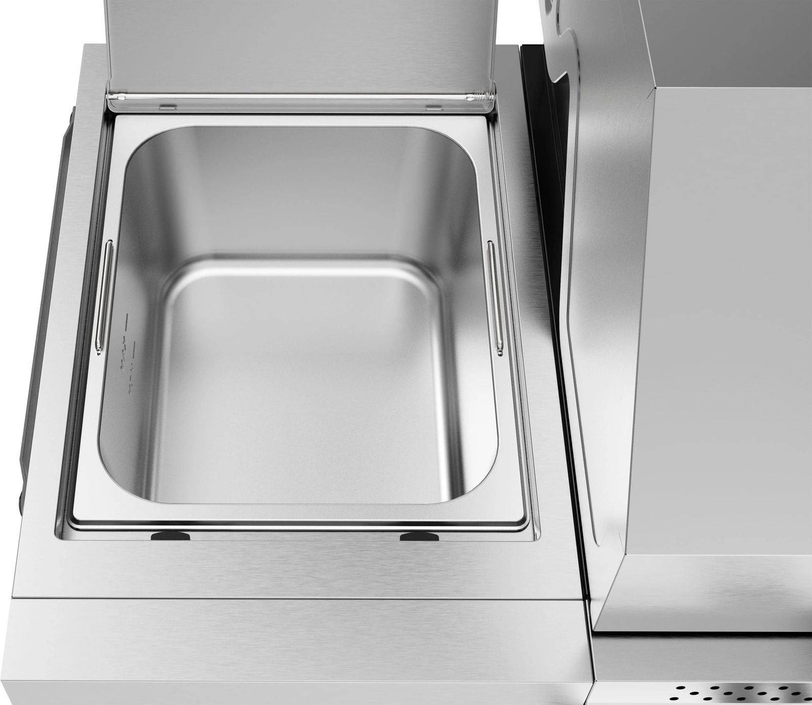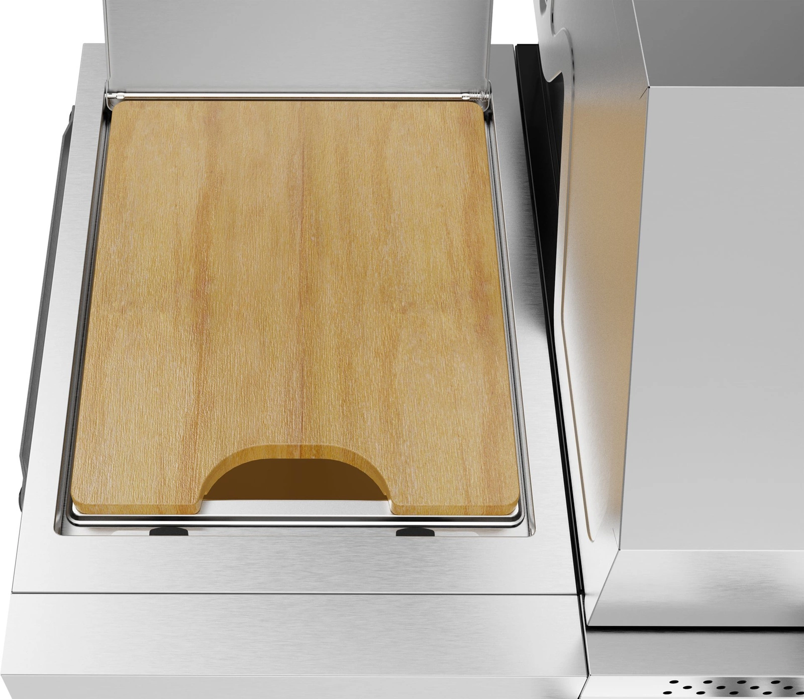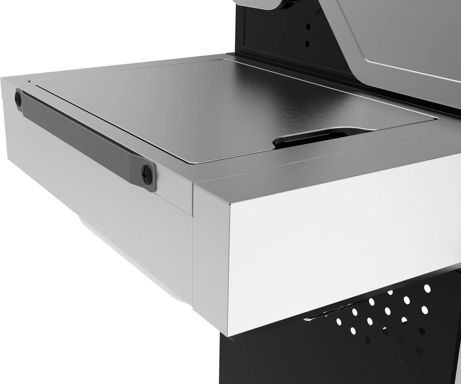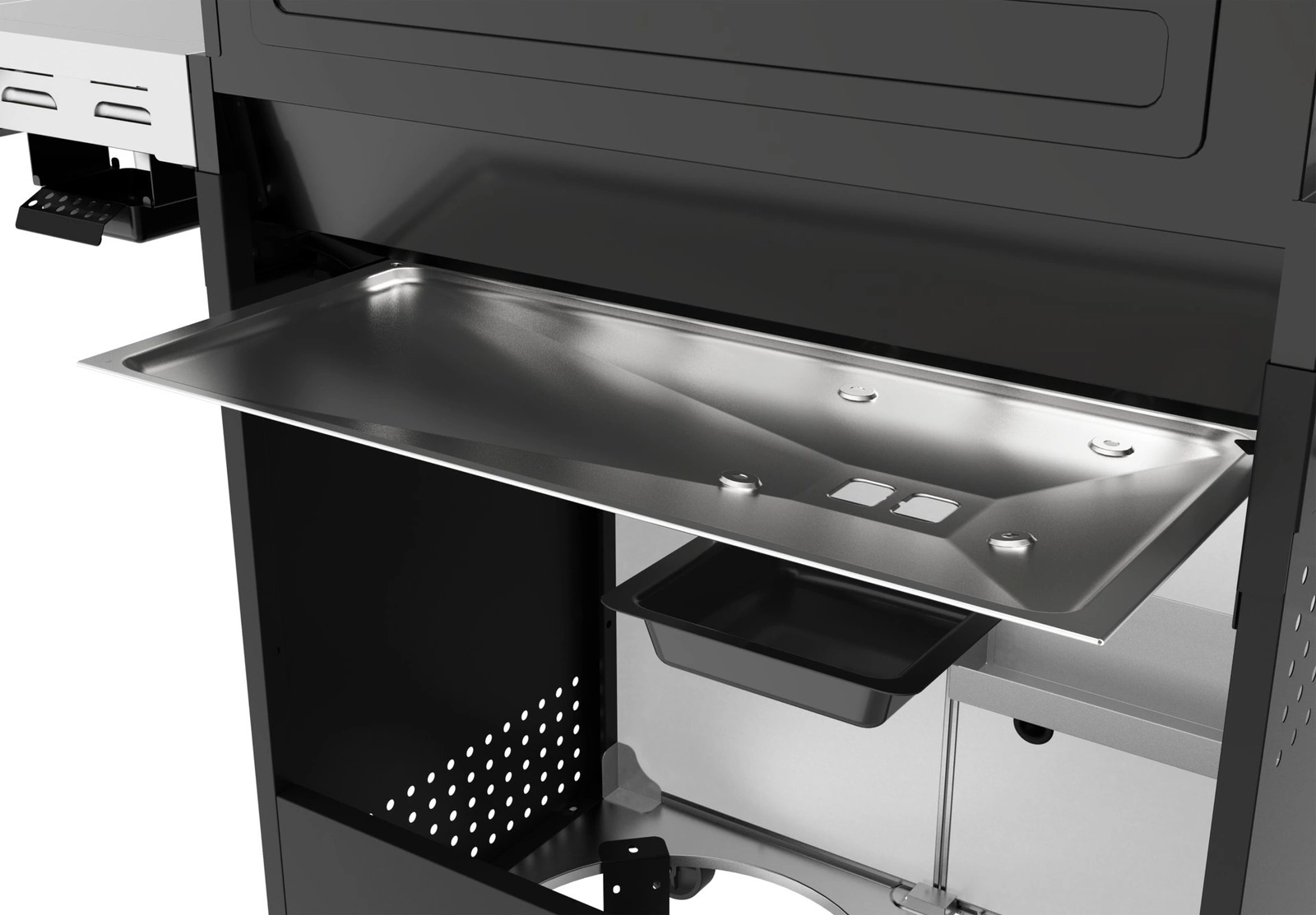 Praktickosť: Bočné poličky s výsuvnou doskou na krájanie a oceľová nádoba na skladovanie surovín alebo hotových jedál. Gril je vybavený aj priehradkou na plynovú fľašu a výsuvnou miskou na tuk, čo uľahčuje udržiavanie čistoty.