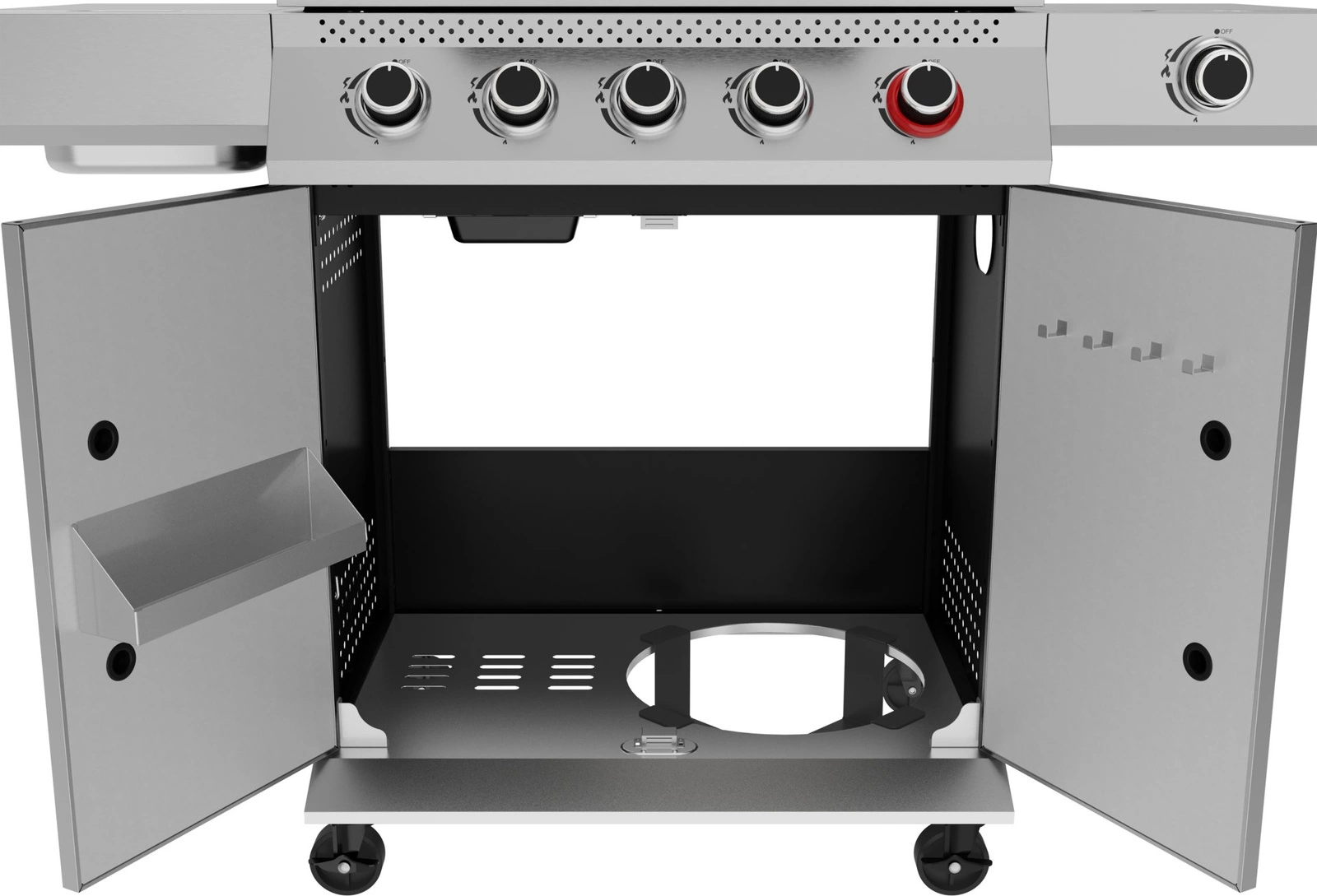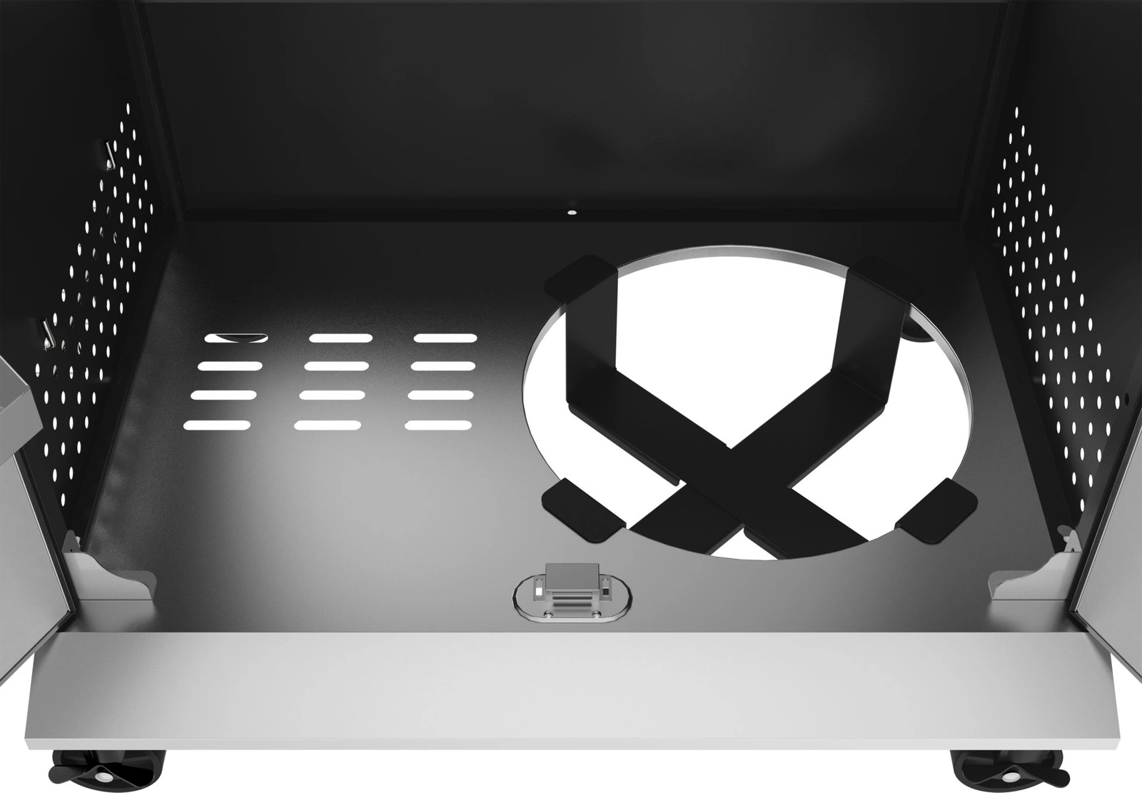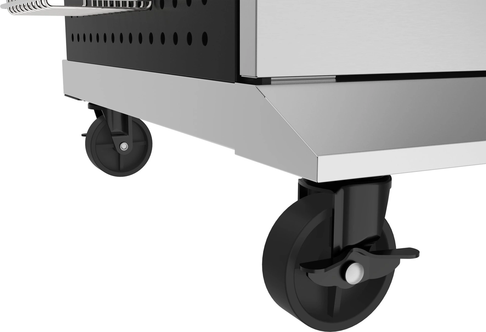 Mobilita a stabilita: Vďaka 4 otočným kolieskam s brzdami je gril ľahko manévrovateľný a stabilitu zabezpečujú veľké madlá na veku a dverách skrinky. Gril má aj skrinku na uskladnenie príslušenstva a korenín.