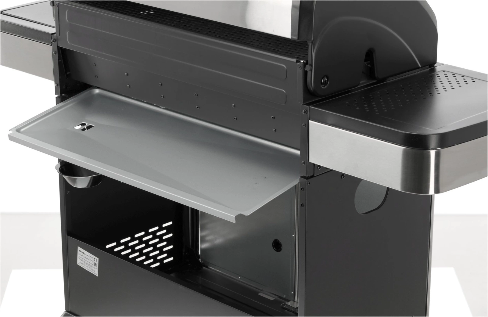 Bočné príslušenstvo: Bočný horák s výkonom 2,2 kW umožňuje varenie alebo ohrievanie polievok, prípravu omáčok či prevarenie vody, čím zvyšuje univerzálnosť grilu. Na bokoch grilu sa navyše nachádzajú praktické poličky a otvárač na fľaše.