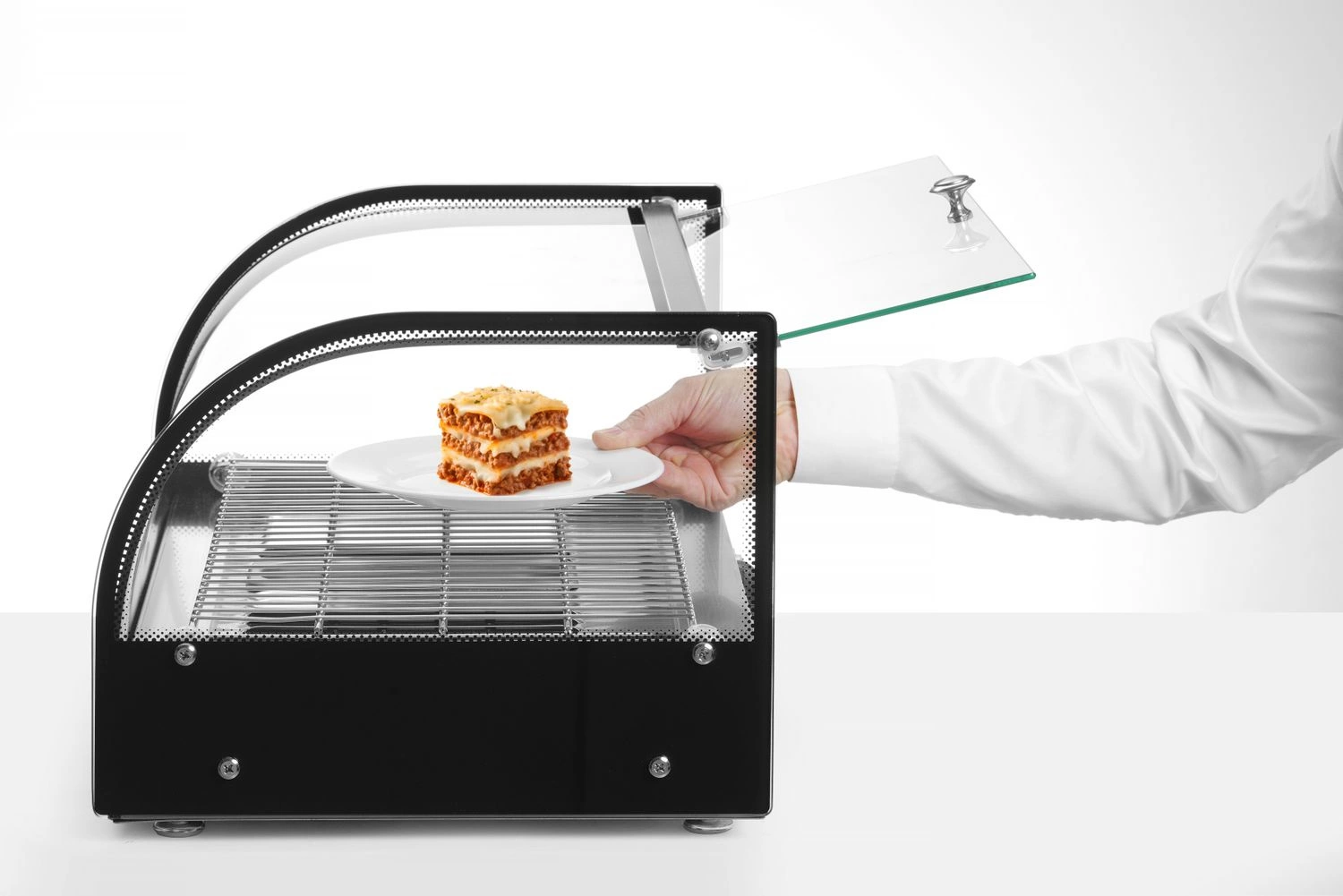 Vyhrievaná vitrína HENDI 273982 bola navrhnutá s dôrazom na pohodlie personálu a estetiku prezentácie. Zaoblené predné sklo nielen priťahuje pozornosť zákazníkov, ale tiež uľahčuje prezentáciu produktov. Na zadnej strane zariadenia sa nachádza veľké otvárateľné sklo, ktoré umožňuje pohodlné dopĺňanie jedál a ich rýchle podávanie. Vyberateľná tácka na omrvinky výrazne urýchľuje proces čistenia zariadenia a pomáha udržiavať vysoký hygienický štandard. Súčasťou balenia je rošt GN 1/1 s jemnými otvormi, ktorý je ideálny na prezentáciu menších produktov, ako sú snacky alebo cukrárenské výrobky.