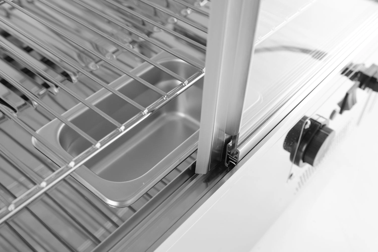 Ohrievacia vitrína HENDI bola navrhnutá s ohľadom na gastronómiu, kde je kľúčová nielen estetická prezentácia jedál, ale aj udržanie ich správnej teploty. Vďaka použitiu dvojitého predného skla a pevného plášťa z nehrdzavejúcej ocele zariadenie účinne chráni obsah pred stratou tepla a uľahčuje udržiavanie čistoty. Posuvné, dvojdielne zadné dvierka umožňujú pohodlné dopĺňanie sortimentu bez narušenia expozície a tri nastaviteľné police umožňujú prispôsobiť usporiadanie vnútra aktuálnym potrebám. LED osvetlenie zabezpečuje, že pokrmy sú vždy dokonale vystavené, čím lákajú zákazníkov k nákupu. Otočný regulátor teploty a analógový teplomer uľahčujú kontrolu podmienok vo vnútri vitríny. Toto riešenie je vhodné ako pre reštaurácie, tak pre cukrárne či jedálne.