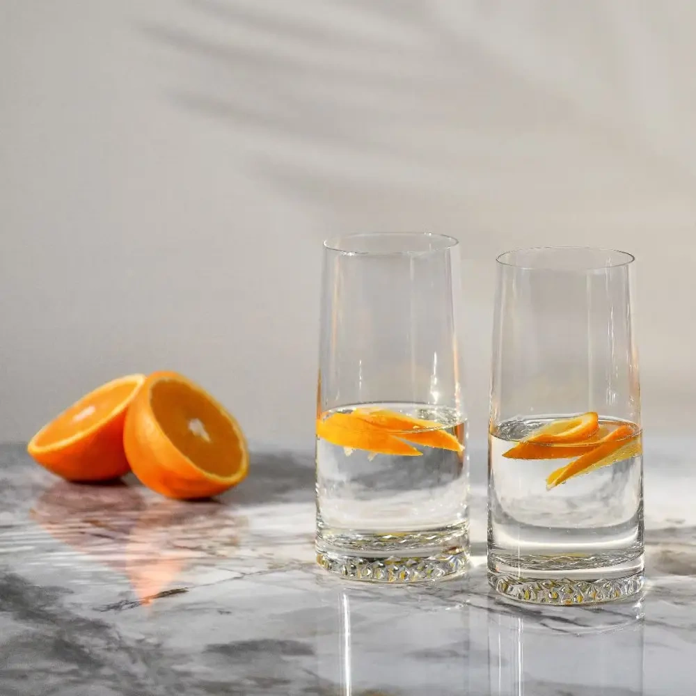 Súprava pozostáva zo šiestich vysokých pohárov vyrobených z vysoko kvalitného skla Crystalline. Každý pohár má výrazne zvýraznené, hrubé dno s ľadovou štruktúrou, ktoré nielen podčiarkuje estetiku, ale aj zvyšuje stabilitu nádoby na stole. Pevné steny zaručujú trvácnosť a odolnosť voči poškodeniu, zatiaľ čo ergonomický tvar zabezpečuje, že poháre dobre padnú do ruky. Vďaka možnosti umývania v umývačke riadu je ich údržba mimoriadne jednoduchá, čo ocenia domáci používatelia aj profesionáli.