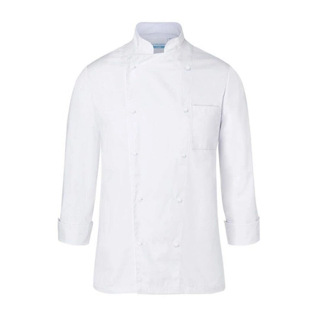 Základná kuchárska mikina Karlowsky. Biela farba, unisex. Vyrobené zo 100 % bavlny 185 g/m2. . Kučeravá väzba. Mikina má pravidelný lem a manžety s rozparkom. Na ľavej strane na hrudi je všité vrecko. Dvojradová blúzka s 10 bielymi gombíkmi. Možno prať v práčke a žehliť. Nesušte v sušičke ani nebielte. Dostupné veľkosti od XS do 4XL