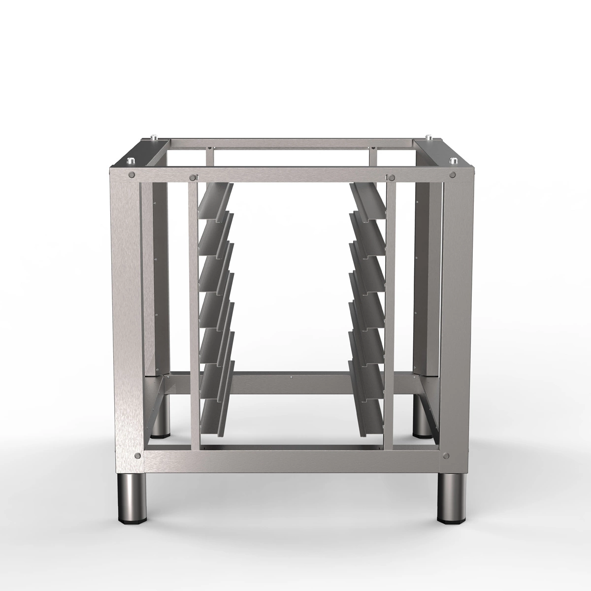 Podstavec PCP11005 nielenže stabilizuje pec, ale výrazne zvyšuje aj funkčnosť pracoviska. Umožňuje skladovanie až siedmich GN 1/1 nádob alebo plechov, čo je mimoriadne užitočné počas intenzívnych kuchynských zmien. Vďaka vhodnému rozstupu vodiacich líšt môžu používatelia pohodlne triediť a skladovať riad, čo zlepšuje chod kuchyne. Súprava obsahuje kompletný podstavec pripravený na montáž pod vybranou pecou OMEGA.