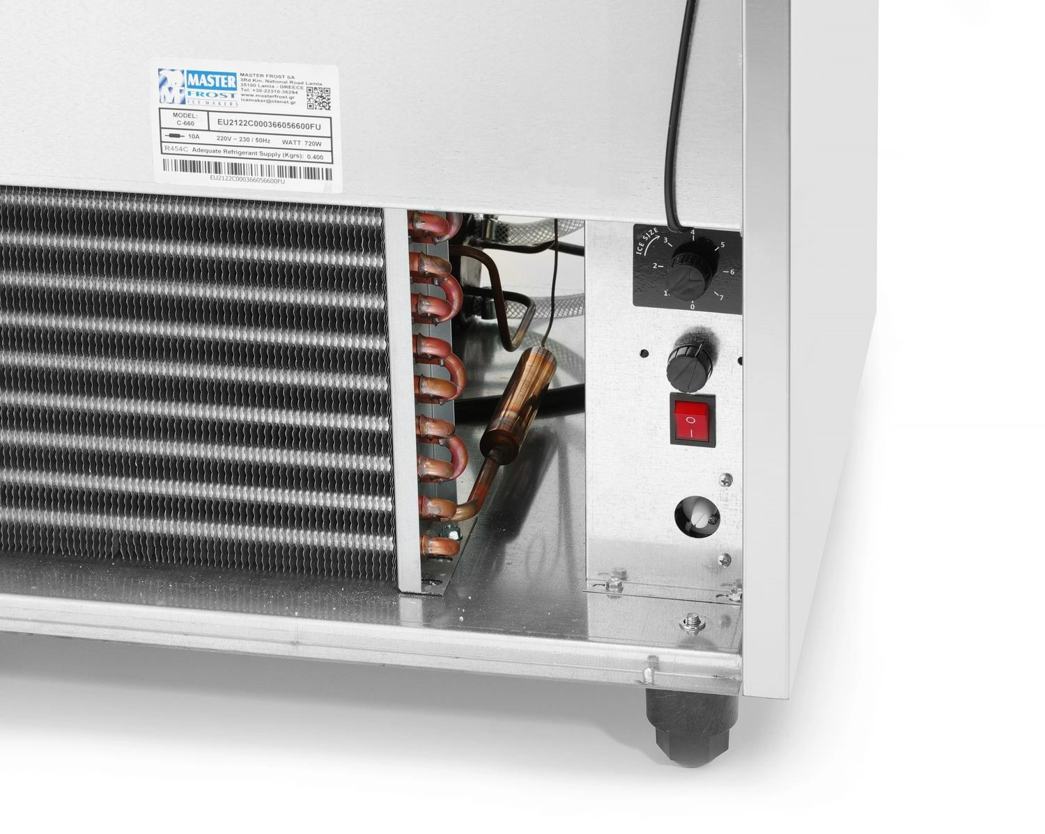 Výrobník kociek ľadu Hendi Master Frost s kapacitou 40 kg/deň. Plášť jednotky je vyrobený z ocele AISI 304 odolnej voči kyselinám, ktorá zaručuje trvanlivosť a odolnosť voči korózii. Pri výrobe kociek sa používa inovatívny systém Interné chladenie(využíva teplo z kompresora, ktorý sa zahrieva), čo znamená, že výrobník kociek ľadu spotrebuje pri výrobe kociek ľadu menej elektrickej energie. Kocky ľadu sa vyrábajú pomocou technológie rozprašovania, vďaka čomu je každá kocka ľadu priehľadná. Kocky majú šesťuholníkový otvorór, ktorý zvyšuje chladiaci výkon nápoja. Systém Kliknite na uľahčuje čistenie spotrebiča a udržuje ho v hygienickom stave len za niekoľko sekúnd. Zariadenie účinne funguje aj pri teplotách do 42 stupňovTo znamená, že výrobník kociek ľadu je vhodný aj na sezónne použitie. Umiestnenie vetracích otvorov v prednej časti zariadenia umožňuje inštaláciu výrobníka kociek pod pracovnú dosku. Nožičky prístroja sú výškovo nastaviteľné. Zásobník má kapacitu 16 kg.