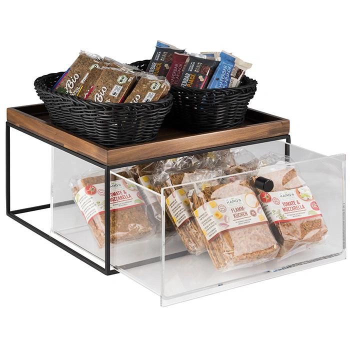 Táto zásuvka na pečivo je ideálna na každodenné použitie v kuchyni, jedálni alebo na raňajkovom bufete v hoteli či reštaurácii. Premyslená konštrukcia zahŕňa stabilný kovový stojan, priestrannú zásuvku s pohodlnou rukoväťou a dosku na krájanie vyrobenú z olejovaného orechového dreva. Vyberateľná tácka umožňuje rýchle odstránenie omrviniek a udržiavanie čistoty.